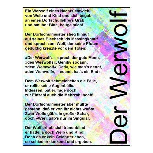 Technical points: 1) Rhyming couplets, except stanza 1 (I wonder why?) 2) meter: iambic tetrameter (four-foot iambs, that is, 4 sets of unstressed/stressed syllables), with occasional extra unstressed syllable at the end of a line (Fälle/Augenbälle; musste/wusste). Iambic tetrameter is a fairly lively metric form and perhaps adds to the playfulness of the poem. 3) run-on line/Zeilensprung: lines 1-2, 17-18, for ex.